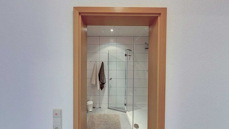 Kein Fenster, aber eine Lüftung. Bodenebene Dusche mit Echtglaswänden, Regenschauerdusche und Handbrause. Waschbecken, WC, Duschhocker. Beleuchteter Spiegelschrank, Badezimmerschrank. 2 Handtücher pro Person, die wöchentlich oder nach Wunsch gewechselt werden. Es stehen Toilettenpapier, Handseife, Duschgel und weitere Toilettenartikel zur Verfügung.